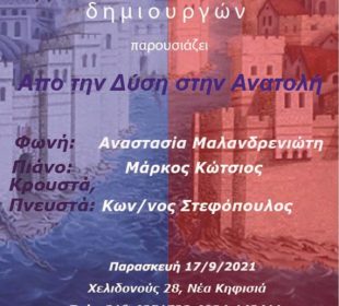 Έναρξη Παρασκευή 1 Οκτωβρίου 2021 στο Vault Theatre plus, Μελενίκου 26 Βοτανικός, Πλησίον στάσης Μετρό Κεραμεικός Η ProvaT.O. Athens (Prova Theatre Organization) συνεχίζει για τρίτη χρονιά το δικό της θεατρικό studio στο χώρο που ...Μουσική βραδιά με χρώματα και αρώματα Δύσης και Ανατολής την Παρασκευή 17 Σεπτεμβρίου στην Galerie ...