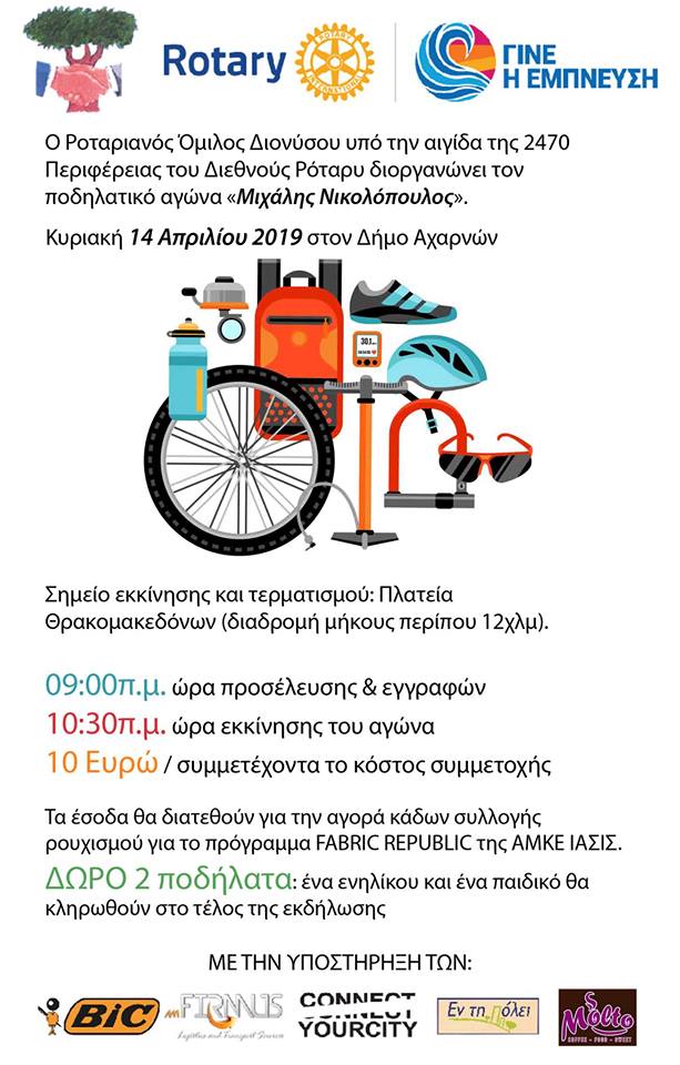 Ποδηλατοδρομία θα πραγματοποιηθεί στις 14/4/2019 με αφετηρία και τερματισμό την πλατεία Θρακομακεδόνων και θα έχει μήκος 10χλμ. Σκοπός Δράσης: Αγορά κάδων συλλογής ...Σγουρός με Κοντάκη και Ασπραδάκη στο Σύλλογο Κρητών Αχαρνών