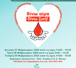 Σύμφωνα με τις προγνώσεις της Ε.Μ.Υ. από το Σάββατο 22/1 και για τις επόμενες μέρες αναμένεται ισχυρή κακοκαιρία με την ονομασία «ΕΛΠΙΔΑ», ...39η Εθελοντική Αιμοδοσία στο Δήμο Αμαρουσίου, με την τήρηση όλων των μέτρων ασφαλείας και πρόληψης ...