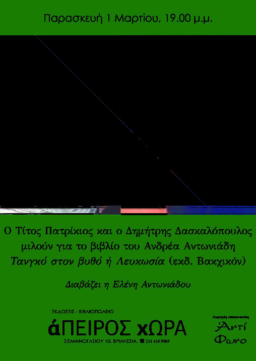Tην Παρασκευή 1η Μαρτίου στις 7.00 μ.μ. θα παρουσιαστεί η νέα ποιητική συλλογή του Ανδρέα Αντωνιάδη Τανγκό στον βυθό ή Λευκωσία (εκδ. Βακχικόν). Για το ...