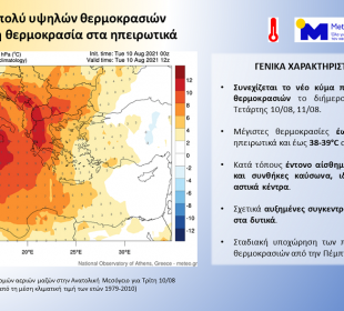 Συνεχίζεται το νέο κύμα πολύ υψηλών θερμοκρασιών το διήμερο Τρίτης-Τετάρτης 10/08-11/08, όπου σύμφωνα με τα διαθέσιμα προγνωστικά στοιχεία του Εθνικού Αστεροσκοπείου Αθηνών / ...