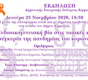 Δευτέρα 23 Νοεμβρίου 18:30 Η Δημοτική Επιτροπή Ισότητας Κηφισιάς με αφορμή τη Διεθνή Ημέρα για την Εξάλειψη της Βίας κατά των Γυναικών ...Στον «Ευαγγελισμό» με κορονοϊό ο Αρχιεπίσκοπος Ιερώνυμος