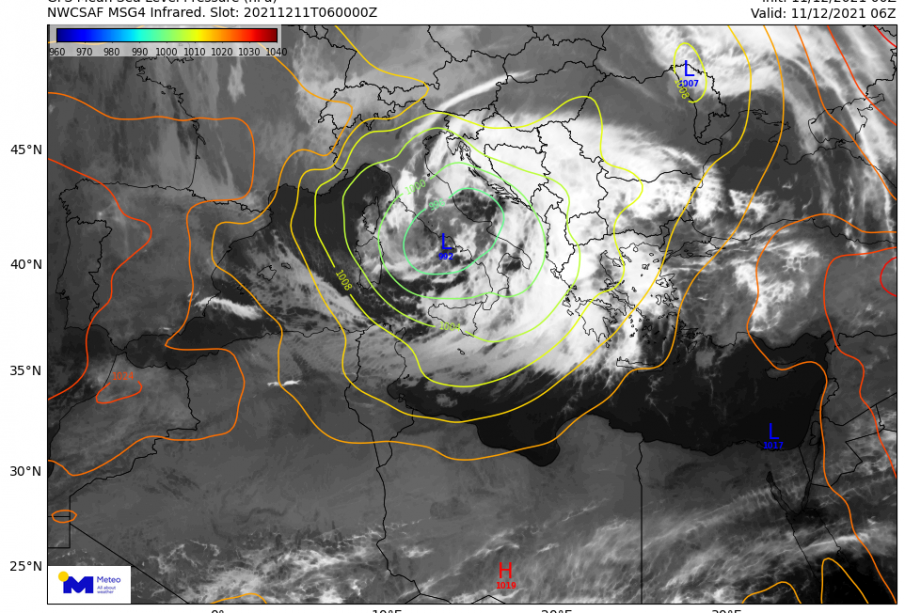 Ισχυρές βροχές σημειώνονται από τις πρώτες ώρες του Σαββάτου 11/12 καθώς ένα βαρομετρικό χαμηλό πλησιάζει από δυτικά τη χώρα μας. Στον Εικόνα 1 παρουσιάζεται η θέση του κέντρου του βαρομετρικού χαμηλού (με “L”) καθώς και οι νεφικοί σχηματισμοί που καλύπτουν το σύνολο σχεδόν του ελληνικού χώρου στις 08:00 τοπική ώρα.