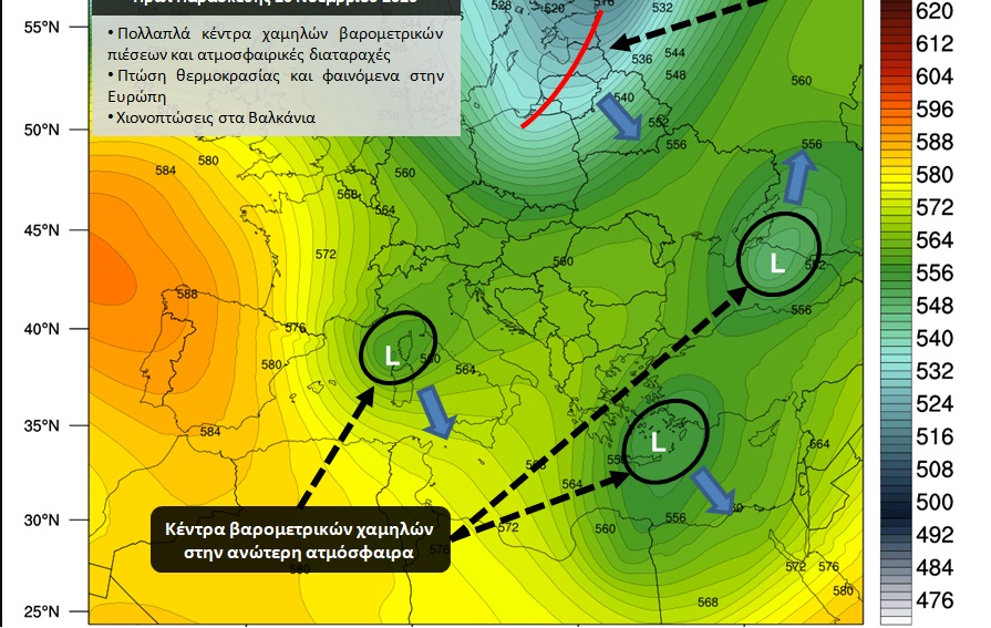 Εκτεταμένη κυκλωνική δραστηριότητα θα επικρατήσει από την Πέμπτη 19/11 στην Ευρώπη, σύμφωνα με τα τελευταία προγνωστικά στοιχεία του Εθνικού Αστεροσκοπείου Αθηνών / meteo.gr. Αποτέλεσμα θα είναι η πτώση της θερμοκρασίας και η εκδήλωση βροχών, καταιγίδων και χιονοπτώσεων στο μεγαλύτερο μέρος αυτής, με εξαίρεση την Ιβηρική Χερσόνησο όπου τα φαινόμενα θα είναι περιορισμένα. Το κύμα κακοκαιρίας θα φέρει και τα πρώτα χιόνια στα Βαλκάνια.