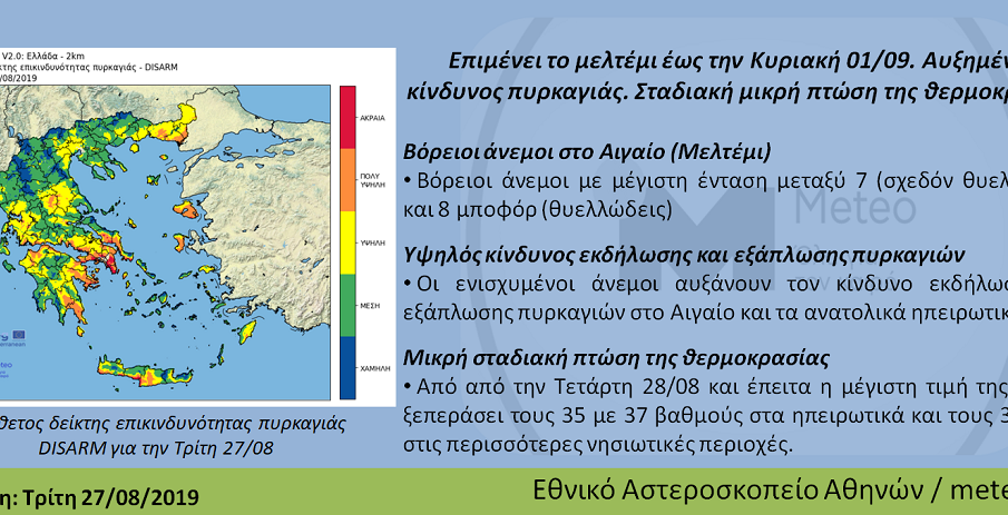 Οι ενισχυμένοι άνεμοι αυξάνουν τον κίνδυνο εκδήλωσης και εξάπλωσης πυρκαγιάς τόσο στο Αιγαίο όσο και στα ανατολικά ηπειρωτικά. Στον παρακάτω χάρτη παρουσιάζεται ο δείκτης επικινδυνότητας πυρκαγιάς για την Τρίτη 27/08. Με πορτοκαλί και κόκκινα χρώματα φαίνονται οι περιοχές με πολύ υψηλή και ακραία επικινδυνότητα.