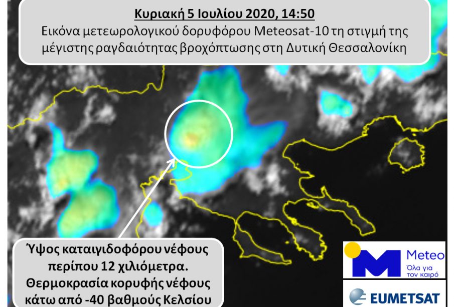 Στην εικόνα του μετεωρολογικού δορυφόρου Meteosat-10, που πάρθηκε στις 14.50 (μέγιστη ραγδαιότητα βροχόπτωσης στο σταθμό του Κορδελιού), φαίνεται ότι η κορυφή του καταιγιδοφόρου νέφους έχει θερμοκρασία κάτω από -40 βαθμούς Κελσίου, φτάνοντας σε ύψος περίπου 12 χιλιομέτρων.