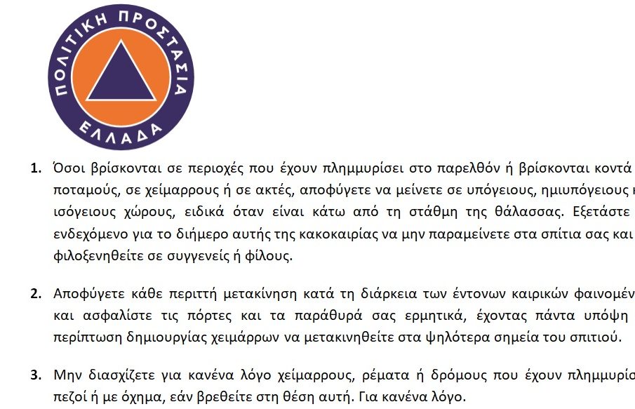 - Όσοι βρίσκονται σε περιοχές που έχουν πλημμυρίσει στο παρελθόν ή βρίσκονται κοντά σε ποταμούς, σε χείμαρρους ή σε ακτές, αποφύγετε να μείνετε σε υπόγειους, ημιυπόγειους και ισόγειους χώρους, ειδικά όταν είναι κάτω από τη στάθμη της θάλασσας. Εξετάστε το ενδεχόμενο για το διήμερο αυτής της κακοκαιρίας να μην παραμείνετε στα σπίτια σας και να φιλοξενηθείτε σε συγγενείς ή φίλους.