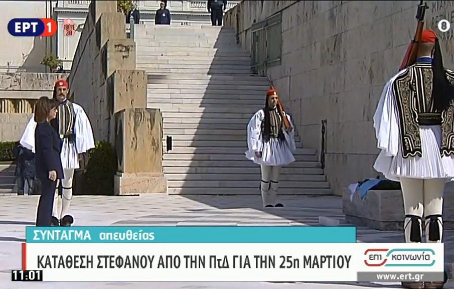 Με λιτό και πάντως διαφορετικό τρόπο τιμάται φέτος η εθνική επέτειος της 25ης Μαρτίου. Στις 11.00λιτή τελετή κατάθεσης στεφάνου στο Μνημείο του Άγνωστου Στρατιώτη, από την Πρόεδρο της Δημοκρατίας Κατερίνα Σακελλαροπούλου, παρουσία του πρωθυπουργού Κυριάκου Μητσοτάκη, του προέδρου της Βουλής Κωνσταντίνου Τασούλα, του αρχηγού της αξιωματικής αντιπολίτευσης Αλέξη Τσίπρα, της προέδρου του Κινήματος Αλλαγής Φώφης Γεννηματά, του γ.γ. του ΚΚΕ Δημήτρη Κουτσούμπα και τους αρχηγούς των Ενόπλων Δυνάμεων.