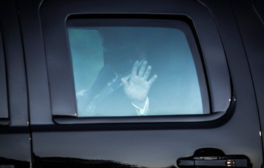 Η οχηματοπομπή αποτελούμενη από μαύρα SUV εμφανίστηκε μπροστά στις πύλες του νοσοκομείου Ουόλτερ Ριντ νωρίς το βράδυ, κι ο Ντόναλντ Τραμπ, με μάσκα, χαιρέτισε μέσα από το κλειστό παράθυρο του αυτοκινήτου της προεδρίας πολυάριθμους υποστηρικτές του.