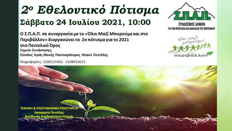 Ο Σύνδεσμος Δήμων για την Προστασία και Ανάπλαση του Πεντελικού (ΣΠΑΠ) συνεχίζοντας την προσπάθεια για την όσο το δυνατόν καλύτερη αποκατάσταση του περιβάλλοντος, διοργανώνει το 2ο Εθελοντικό Πότισμα για το 2021 στην περιοχή που αναδασώθηκε τα3 προηγούμενα χρόνια, στην Νταού Πεντέλη, σε συνεργασία με το «Όλοι Μαζί Μπορούμε και στο Περιβάλλον», το Σάββατο 24Ιουλίου 2021 και ώρα 10 π.μ.