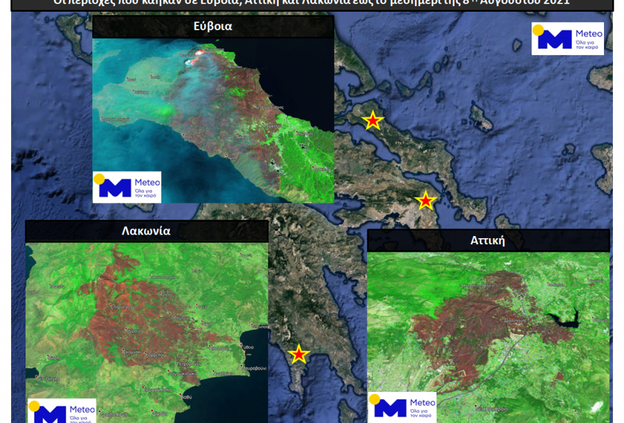 Στις 12:20 περίπου της Κυριακής 08/08, ο ευρωπαϊκός περιβαλλοντικός δορυφόρος Sentinel-2 κατέγραψε εικόνες υψηλής ανάλυσης από τις καμένες περιοχές σε Εύβοια, Αττική και Λακωνία, βοηθούμενος από τις ανέφελες συνθήκες που επικράτησαν στη χώρα. Στο Εθνικό Αστεροσκοπείο Αθηνών / meteo.gr συλλέξαμε και επεξεργαστήκαμε τις εικόνες αυτές ώστε να εκτιμήσουμε το μέγεθος των καμένων εκτάσεων. Όπως προκύπτει, έως το μεσημέρι της Κυριακής 08/08 έχουν καεί περίπου 460.000 στρέμματα στην Εύβοια, 80.000 στρέμματα στην Αττική και 110.000 στρέμματα στη Λακωνία, ανεβάζοντας το σύνολο των καμένων εκτάσεων στα 650.000 στρέμματα τουλάχιστο. Με δεδομένο ότι οι πυρκαγιές στην Εύβοια συνεχίζουν να καίνε, η παραπάνω εκτίμηση είναι πολύ πιθανό να μεταβληθεί τις επόμενες ημέρες. Στο σχήμα που ακολουθεί παρουσιάζονται σε ένθετες εικόνες οι καμένες περιοχές με καφέ αποχρώσεις. Ιδιαίτερα στην ένθετη εικόνα της Βόρειας Εύβοιας φαίνεται ο καπνός από τις πυρκαγιές ενώ με κόκκινους και πορτοκαλί χρωματισμούς φαίνονται τα κυριότερα ενεργά μέτωπα, τόσο στα βόρεια του νησιού αλλά και νοτιότερα, προς το Τρούπι και τα Καλύβια.