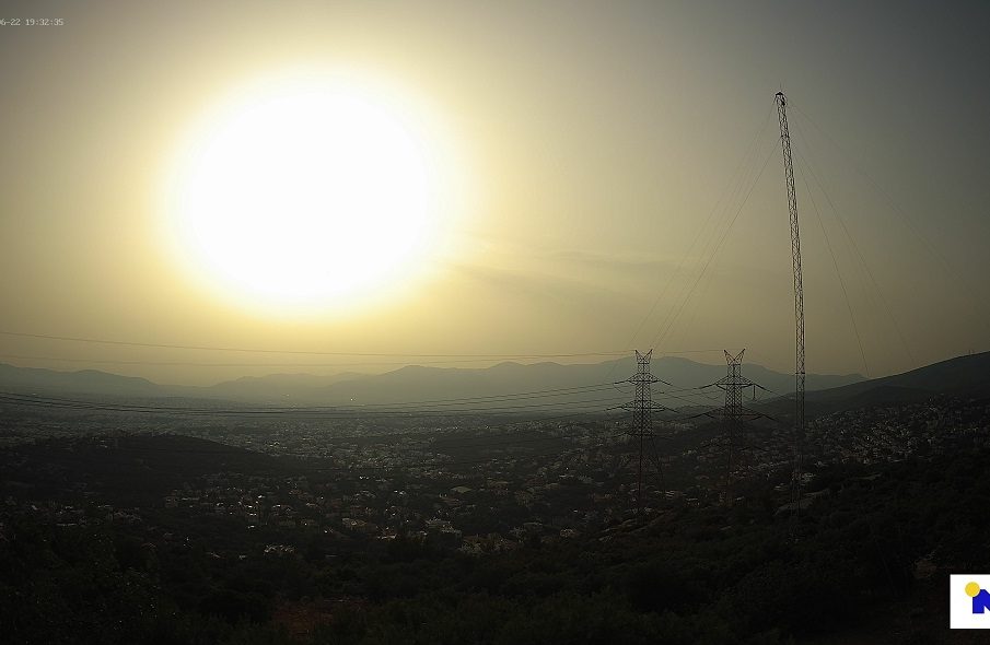 Αυξημένες συγκεντρώσεις Αφρικανικής σκόνης υπήρχαν στην ατμόσφαιρα την Τρίτη 22/06, όπως διακρίνεται χαρακτηριστικά στο στιγμιότυπο της μετεωρολογικής κάμερας που βρίσκεται στις εγκαταστάσεις του Αστεροσκοπείου Πεντέλης και έχει κατεύθυνση προς την πόλη της Αθήνας. Παράλληλα, οι μέγιστες θερμοκρασίες στα ηπειρωτικά ξεπέρασαν τους 39 βαθμούς Κελσίου. Στον πίνακα που περιέχεται στην εικόνα παρουσιάζονται οι 8 υψηλότερες μέγιστες θερμοκρασίες, όπως καταγράφηκαν από το δίκτυο αυτόματων μετεωρολογικών σταθμών του Εθνικού Αστεροσκοπείου Αθηνών/meteo.gr.