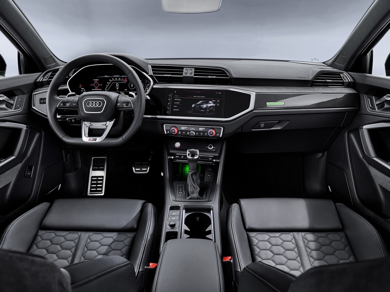 Τα σπορ καθίσματα με επένδυση σε μαύρο δέρμα/Alcantara με το λογότυπο RS τονίζουν το σπορ χαρακτήρα των RS Q3 και RS Q3 Sportback. Τα σπορ καθίσματα RS με επενδύσεις από εξαιρετικό δέρμα Nappa, κυψελοειδές σχέδιο και ενσωματωμένα προσκέφαλα είναι για πρώτη φορά διαθέσιμα στο Q3. Οι ραφές με μοτίβο αντίθεσης είναι στάνταρ μαύρες και προαιρετικά μπλε ή κόκκινες. Όταν επιλέγεται ένα από τα δύο πακέτα σχεδιασμού RS σε κόκκινο ή μπλε χρώμα, οι λεπτομέρειες στο τιμόνι, οι ζώνες ασφαλείας, τα πατάκια και ο επιλογέας ταχυτήτων είναι έγχρωμα, ενώ το τιμόνι και ο επιλογέας έχουν επένδυση από Alcantara. Με τα διευρυμένα πακέτα σχεδιασμού RS, οι επενδύσεις των θυρών και τα υποβραχιόνιά τους είναι σε κόκκινο ή μπλε Alcantara. Οι λεπτομέρειες που αντίστοιχα είναι σε Race αλουμίνιο ή ανθρακί και προαιρετικά σε φινίρισμα piano black ή ανθρακονήματος ολοκληρώνουν το σπορ εσωτερικό, που μπορεί να είναι τελείως μαύρο. Ο φωτισμός εισόδου με την προβολή Audi Sport στις πόρτες καλωσορίζει τον οδηγό και τον συνοδηγό. Τα λογότυπα RS κοσμούν το εσωτερικό στο τιμόνι και τα φωτιζόμενα διακοσμητικά στα μαρσπιέ των εμπρός θυρών. Το δερμάτινο σπορ και επίπεδο στο κάτω μέρος τιμόνι RS, με τα νέας σχεδίασης paddles, διαθέτει πολύ-λειτουργικά κουμπιά για τον έλεγχο των δύο προαιρετικών λειτουργιών RS στο Audi drive select. Στο Audi Virtual Cockpit Plus οι ειδικές οθόνες RS ενεργοποιούνται αυτόματα.