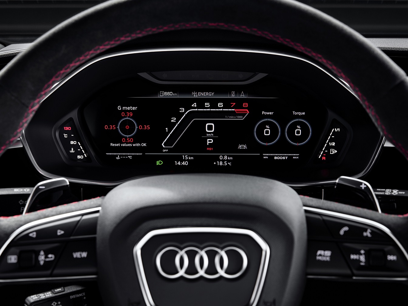 Οι ειδικές ενδείξεις RS στο Audi Virtual Cockpit Plus παρέχουν πληροφορίες σχετικά με την πίεση των ελαστικών, τη ροπή, την ισχύ, τους χρόνους γύρου πίστας, τις δυνάμεις g καθώς και μετρήσεις επιτάχυνσης.