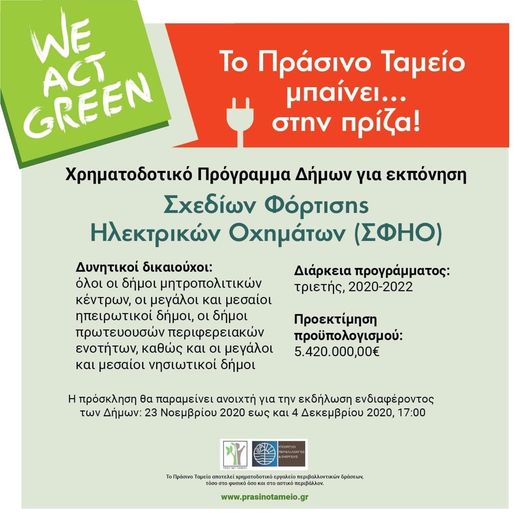 Μέσα στους επόμενους μήνες, οι δήμοι θα κληθούν να χωροθετήσουν τα σημεία φόρτισης και στάθμευσης των ηλεκτρικών οχημάτων. Ξεκινάει το πρόγραμμα χρηματοδότησης των Δήμων από το Πράσινο Ταμείο, αρχικού προϋπολογισμού 5.42 εκατ. € για την εκπόνηση των Σχεδίων Φόρτισης Ηλεκτρικών Οχημάτων.