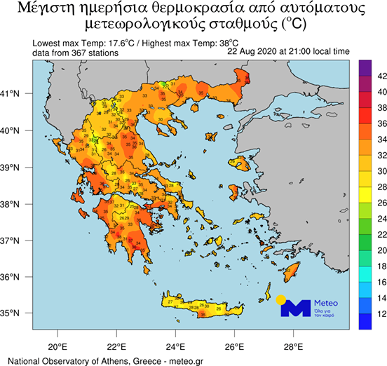 Η θερμοκρασία θα κυμανθεί στη Δυτική Μακεδονία από 10 έως 32 βαθμούς, στην υπόλοιπη Βόρεια Ελλάδα από 12 έως 36, στη Θεσσαλία και στην Ήπειρο από 15 έως 37 βαθμούς, στα υπόλοιπα ηπειρωτικά από 17 έως 37, στα νησιά του Ιονίου από 18 έως 34 βαθμούς, και στα νησιά του Αιγαίου από 18 έως 32 βαθμούς, αλλά στα νησιά του Ανατολικού Αιγαίου και στη Ρόδο οι μέγιστες θα φτάσουν στους 35 με 36 βαθμούς. Παράλληλα, στις πεδιάδες της Μακεδονίας και της Θεσσαλίας, στη Δυτική Στερεά και στη Νότια Πελοπόννησο οι μέγιστες θα φτάσουν τοπικά στους 38 με 39 βαθμούς Κελσίου.