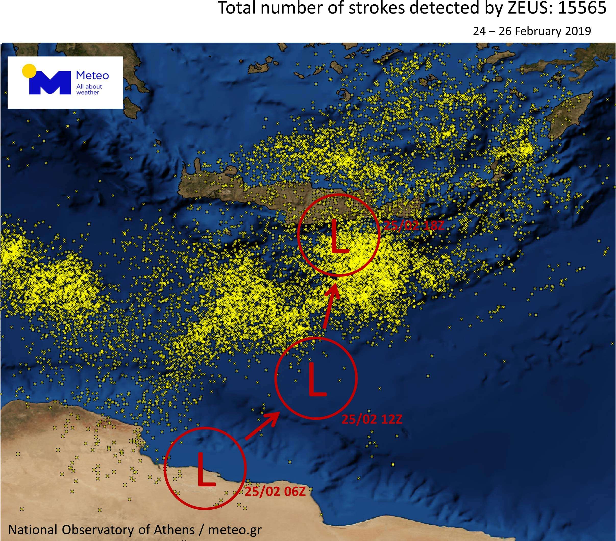 Στον Χάρτη 1 σημειώνονται με “L” οι διαδοχικές θέσεις του βαρομετρικού χαμηλού την Δευτέρα 25 Φεβρουαρίου ενώ με κίτρινα στίγματα τα κεραυνικά πλήγματα του τριημέρου 24-26 Φεβρουαρίου, όπως καταγράφηκαν από το σύστημα ανίχνευσης κεραυνών ΖΕΥΣ του Εθνικού Αστεροσκοπείου Αθηνών. Συνολικά περισσότεροι από 15.500 κεραυνοί καταγράφηκαν στην ευρύτερη περιοχή της Κρήτης.
