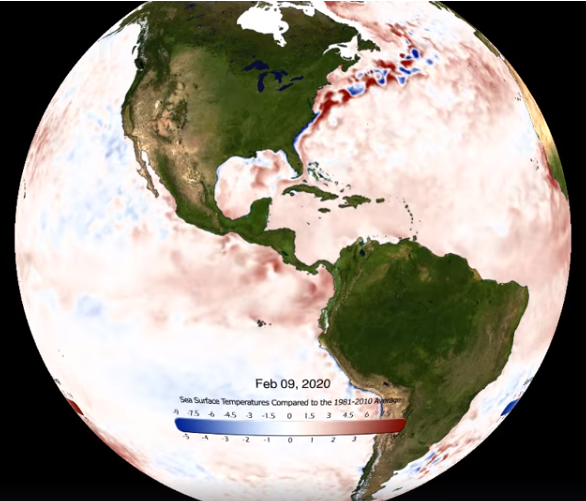 Στο βίντεο θα διακρίνετε τις αποκλίσεις της θερμοκρασίας της επιφάνειας της θάλασσας σε σχέση με τις κλιματικές τιμές της περιόδου 1981-2010, όπου το κόκκινο δείχνει τις μεγαλύτερες θετικές αποκλίσεις.