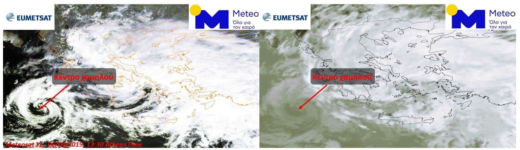 Ένα κέντρο χαμηλό πιέσεων με κάπως ιδιαίτερα μορφολογικά χαρακτηριστικά βρίσκεται στο Νότιο Ιόνιο το μεσημέρι του Σαββάτου 06/04. Πιο συγκεκριμένα, θερμοκρασιακή αναστροφή στη μέση τροπόσφαιρα περιορίζει την καθ’ ύψος ανάπτυξη των νεφών, δημιουργώντας έναν στρόβιλο με ασυνήθιστα χαμηλές νεφώσεις. Όπως έχουμε εξηγήσει σε παλιότερο άρθρο μας (http://www.meteo.gr/article_view.cfm?entryID=940), στο ορατό φάσμα τα νέφη φαίνονται λευκότερα όταν αυτά είναι πιο πυκνά, ενώ στο υπέρυθρο φάσμα η «λευκότητα» ενός σχηματισμού είναι αντιστρόφως ανάλογη της θερμοκρασίας της κορυφής τους, δηλαδή του ύψους τους. Παρατηρείστε πόσο λαμπερός φαίνεται ο στρόβιλος στο ορατό φάσμα (αριστερά) και πόσο σκούρος στο υπέρυθρο (δεξιά). Στις ίδιες εικόνες σημειώνεται και η θέση του κέντρου του χαμηλού.