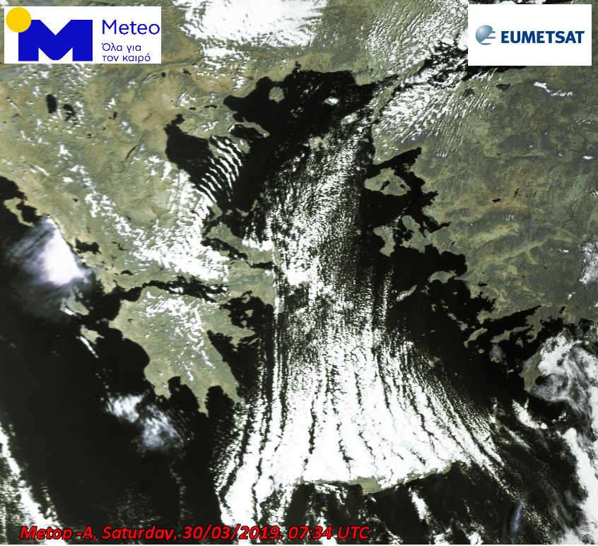 Οι θυελλώδεις βόρειοι άνεμοι που πνέουν στο Αιγαίο και το Κρητικό Πέλαγος δημιούργησαν εντυπωσιακούς νεφικούς σχηματισμούς. Όπως φαίνεται στην εικόνα που ακολουθεί και η οποία «τραβήχτηκε» από τον Ευρωπαϊκό μετεωρολογικό δορυφόρο πολικής τροχιάς Metop-A στις 09:30 σήμερα το πρωί (Σάββατο, 30/03/2019), οι γραμμές των νεφών ακολουθούν πιστά την πνοή του ανέμου στα κατώτερα στρώματα της τροπόσφαιρας.