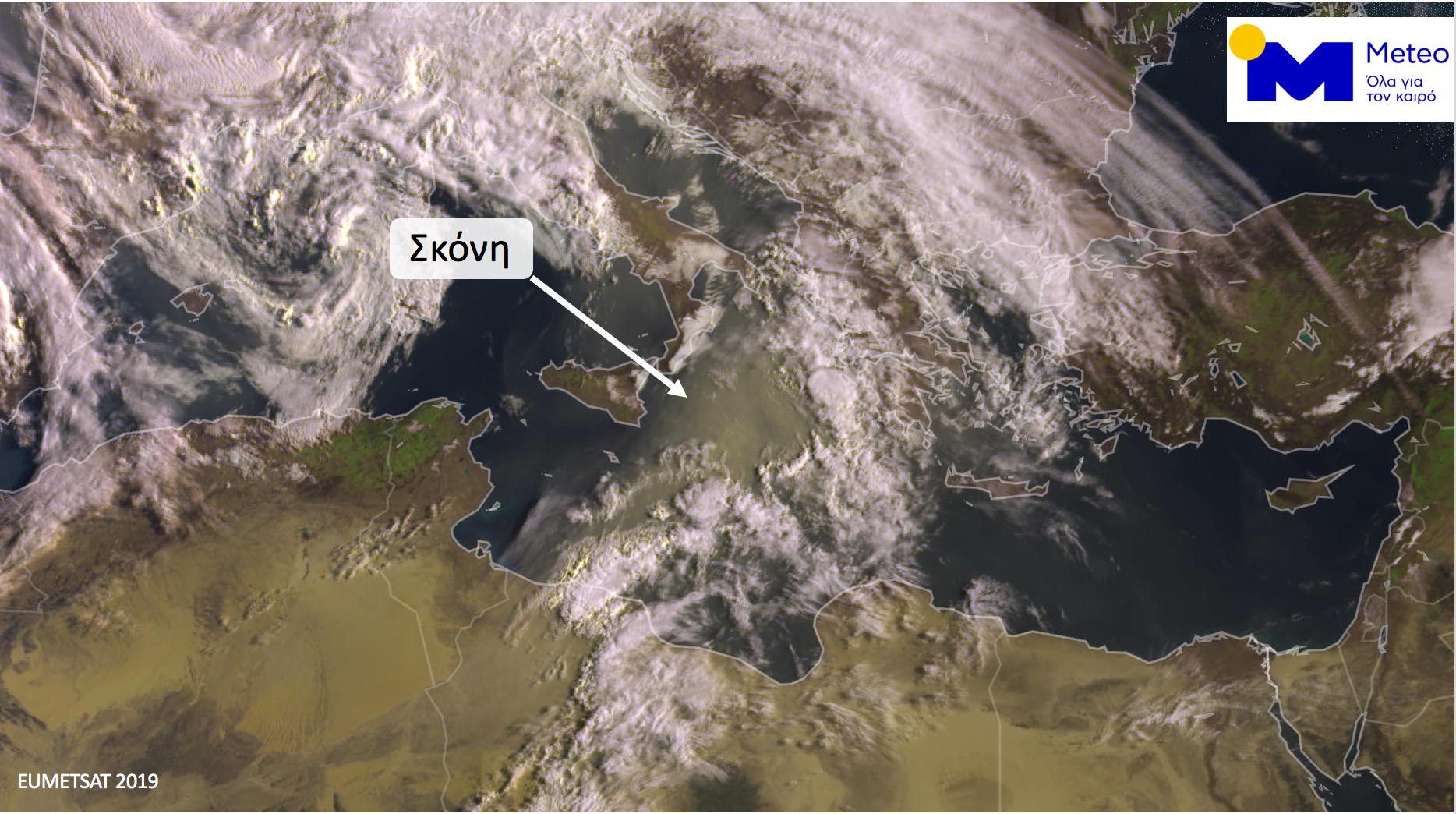 Στην παρακάτω εικόνα βλέπετε τη μεγάλη συγκέντρωση σκόνης στην Κεντρική Μεσόγειο που κινείται προς τη χώρα μας το πρωί της Μ. Τρίτης 23 Απριλίου 2019. Η δορυφορική λήψη και επεξεργασία της εικόνας από το Εθνικό Αστεροσκοπείο Αθηνών/meteo.gr έγινε στις 09:30.