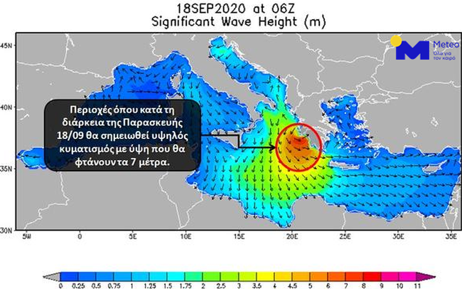 Σύμφωνα με τα προγνωστικά στοιχεία του Εθνικού Αστεροσκοπείου Αθηνών / Meteo.gr, κατά τη διάρκεια της Παρασκευής 18/09/2020, ο Μεσογειακός Κυκλώνας ΙΑΝΟΣ θα επηρεάσει τα νησιά του Κεντρικού Ιονίου και παράκτια τμήμα της Δ. Ελλάδας με κύματα το ύψος των οποίων θα φτάνει τα 7 μέτρα, όπως φαίνεται στον προγνωστικό χάρτη κυματισμού.