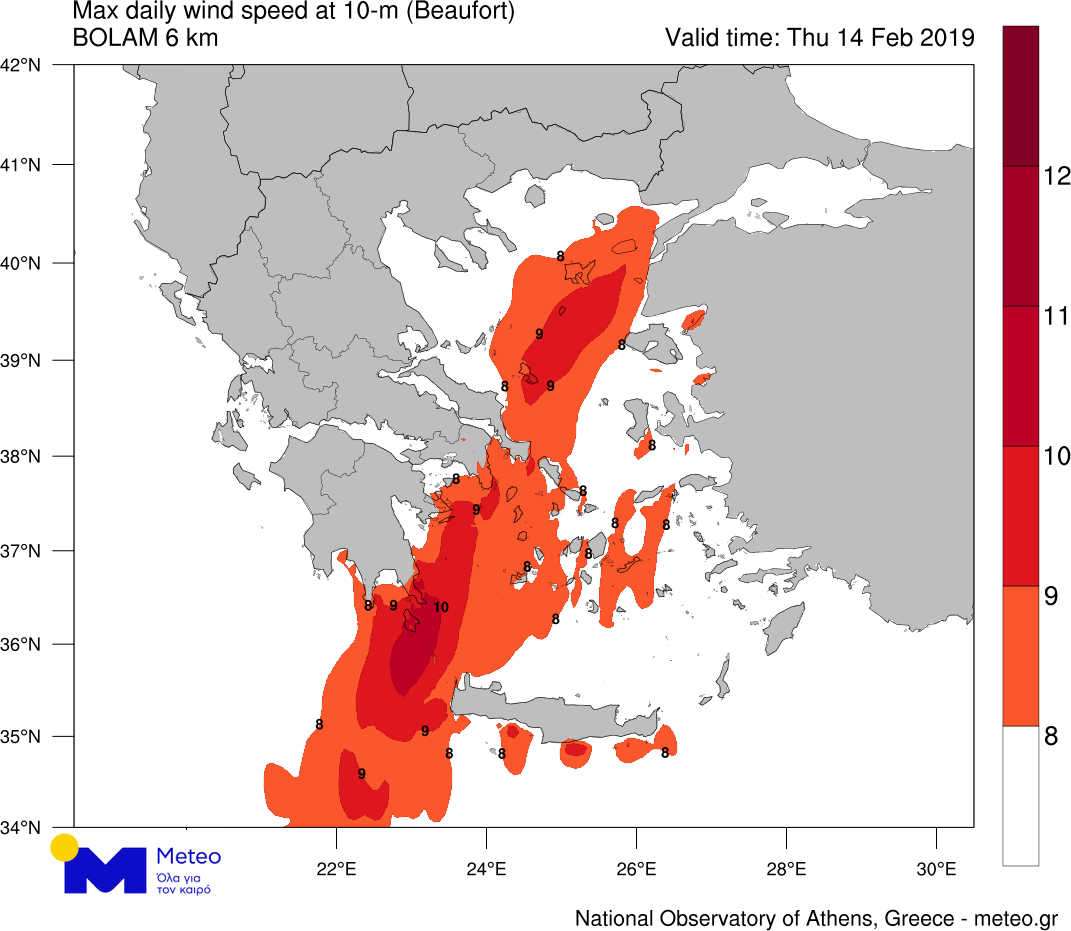 Οι θυελλώδεις και πολύ θυελλώδεις βόρειοι άνεμοι αναμένεται να συνεχίσουν έως το απόγευμα της Πέμπτης 14/02, ενώ στη συνέχεια θα εξασθενήσουν σταδιακά κατά 1 έως 2 μποφόρ. Στον χάρτη που ακολουθεί φαίνονται οι περιοχές όπου η ισχύς του ανέμου αναμένεται να ξεπεράσει τα 8 μποφόρ. Παράλληλα, τα φαινόμενα θα περιοριστούν στο Νότιο Αιγαίο και την Κρήτη και θα εξασθενήσουν.