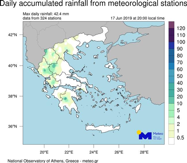 Βροχές και καταιγίδες που τοπικά ήταν ισχυρές εκδηλώθηκαν κατά τη διάρκεια της Δευτέρας 17/06/2019 στα ηπειρωτικά τμήματα της χώρας και στο Ανατολικό Αιγαίο. Παράλληλα, το σύστημα εντοπισμού κεραυνών του Εθνικού Αστεροσκοπείου Αθηνών «ΖΕΥΣ»κατέγραψε μέχρι τις 20:30 περισσότερους από 4200 κεραυνούς. Στις περιοχές που επηρεάστηκαν συμπεριλαμβάνονται τα νότια τμήματα του Υμηττού και τα νότια παράλια της Αττικής όπου εκδηλώθηκαν ισχυρές καταιγίδες, με έμφαση στην περιοχή της Βάρης.
