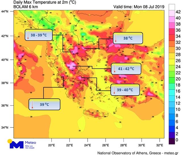 Μικρή περαιτέρω άνοδο αναμένεται να σημειώσει η θερμοκρασία τη Δευτέρα 08/07/2019. Σύμφωνα με τα προγνωστικά στοιχεία οι μέγιστες τιμές της θερμοκρασίας θα φτάσουν τους 39 βαθμούς στα ηπειρωτικά, ενώ σε περιοχές της Στερεάς και κυρίως της Θεσσαλίας θα ξεπεράσουν τους 40 βαθμούς. Στο χάρτη που ακολουθεί παρουσιάζονται ενδεικτικά οι περιοχές όπους αναμένεται να σημειωθούν οι υψηλότερες θερμοκρασίες τη Δευτέρα.