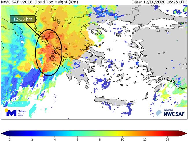 Ισχυρές καταιγίδες επηρεάζουν τα νησιά του Ιονίου και τη Δυτική Ελλάδα κατά τις βραδινές της Δευτέρας 12/10. Ενδεικτικό της έντασης των φαινομένων είναι το γεγονός πως οι κορυφές των καταιγιδοφόρων νεφών ξεπερνούν τα 12 χιλιόμετρα, όπως διακρίνεται με κόκκινες αποχρώσεις στη δορυφορική εικόνα που ακολουθεί.