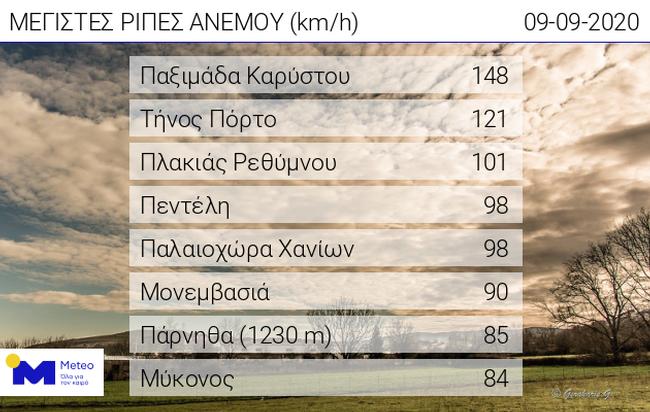 Θυελλώδεις (8 μποφόρ) έως πολύ θυελλώδεις (9 μποφόρ) βόρειοι άνεμοι πνέουν κατά τόπους στο Αιγαίο την Τετάρτη 09/09. Όπως αναμέναμε και σας ενημερώσαμε σχετικά στην προηγούμενη ανακοίνωσή μας, ισχυρότατες ριπές καταγράφονται σε περιοχές καναλισμού του ανέμου, όπως για παράδειγμα μεταξύ της Νότιας Εύβοιας και της Άνδρου. Χαρακτηριστικό είναι ότι ο σταθμός της Παξιμάδας Καρύστου κατέγραψε ριπή 148 χλμ/ώρα στις 09:46. Στον πίνακα που ακολουθεί παρουσιάζονται οι 8 σταθμοί του δικτύου αυτόματων μετεωρολογικών σταθμών του Εθνικού Αστεροσκοπείου Αθηνών / meteo.gr που κατέγραψαν τις ισχυρότερες ριπές ανέμου έως το μεσημέρι της Τετάρτης 09/09.