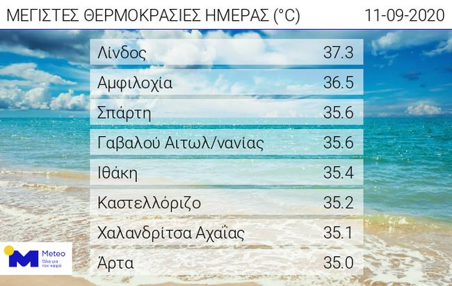 Σε υψηλά επίπεδα έφτασε κατά τόπους η θερμοκρασία την Παρασκευή 11 Σεπτεμβρίου 2020. Η υψηλότερη τιμή της καταγράφηκε στη Λίνδο και ήταν ίση με 37.3 βαθμούς. Στον πίνακα που ακολουθεί φαίνονται οι 8 υψηλότερες θερμοκρασίες που κατέγραψε το δίκτυο αυτόματων μετεωρολογικών σταθμών του Εθνικού Αστεροσκοπείου Αθηνών / meteo.gr.