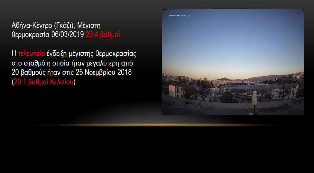 Μετά από 100 ημέρες, η μέγιστη θερμοκρασία στο Κέντρο της Αθήνας (σταθμός του Εθνικού Αστεροσκοπείου/meteo.gr στο Γκάζι), στην Τετάρτη 6 Μαρτίου 2019 ξεπέρασε το όριο των 20 βαθμών.
