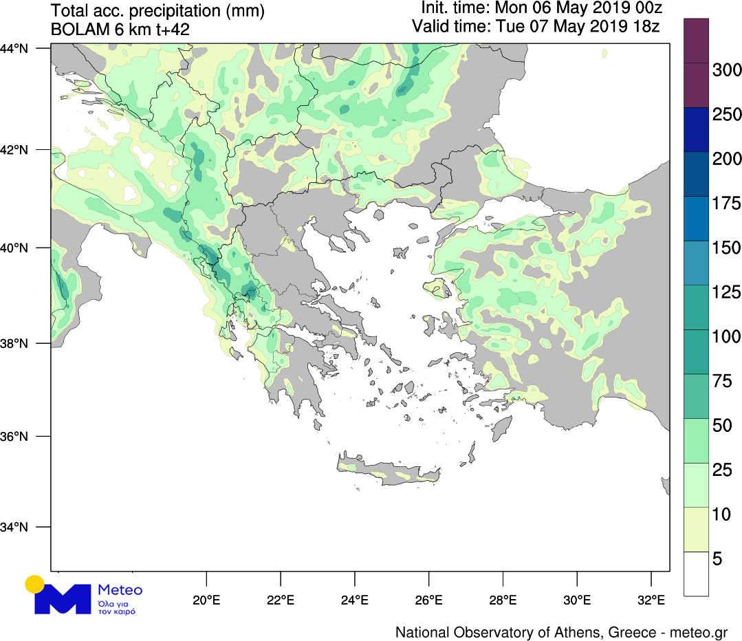 Χάρτης 1: Η ολική βροχόπτωση που αναμένεται έως και το βράδυ της Τρίτης 06/05