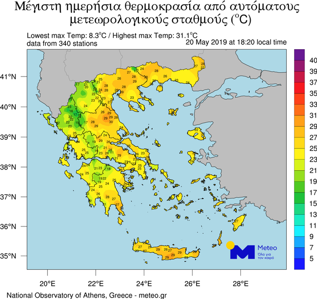 Σχετικά υψηλές για την εποχή θερμοκρασίες σημειώθηκαν τις μεσημεριανές ώρες της Δευτέρας 20 Μαΐου 2019, με τις πιο ζεστές περιοχές να ανήκουν στα ανατολικά και νότια τμήματα, όπως καταγράφτηκε από δίκτυο αυτόματων μετεωρολογικών σταθμών του Εθνικού Αστεροσκοπείου Αθηνών / meteo.gr και παρουσιάζεται στον παρακάτω Χάρτη.