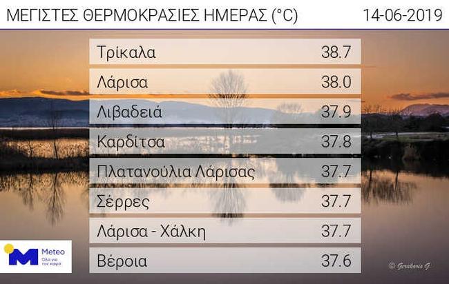 Πολύ υψηλές ήταν οι θερμοκρασίες που σημειώθηκαν το μεσημέρι της Παρασκευής 14/06. ΣτηΘεσσαλική πεδιάδα η μέγιστη θερμοκρασία ξεπέρασε κατά τόπους τους 38 βαθμούς Κελσίου,φτάνοντας τους 38.2 βαθμούς στο μετεωρολογικό σταθμό των Τρικάλων. Στον πίνακα που ακολουθεί φαίνονται οι 8 σταθμοί του δικτύου αυτόματων μετεωρολογικών σταθμών του Εθνικού Αστεροσκοπείου Αθηνών /meteo.gr στους οποίους καταγράφηκαν οι υψηλότερες μέγιστες θερμοκρασίες.