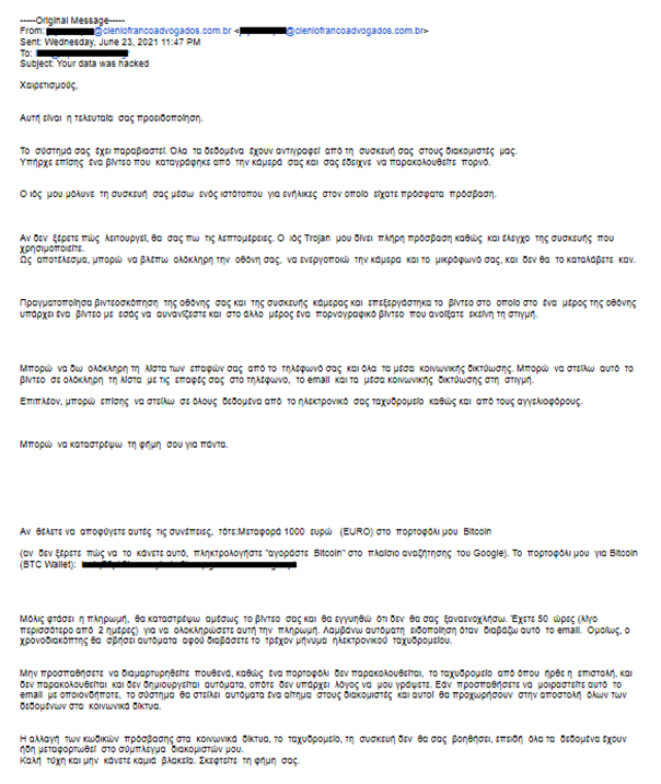 Στη Διεύθυνση Δίωξης Ηλεκτρονικού Εγκλήματος καταγγέλλονται το τελευταίο διάστημα περιπτώσεις διεθνούς απάτης γνωστής ως «απάτη μέσω σεξουαλικής εκβίασης – “sextortionscam”» που εκδηλώνεται με μαζική αποστολή μηνυμάτων ηλεκτρονικού ταχυδρομείου σε διάφορους αποδέκτες, ανεξαρτήτως φύλου και ηλικίας, με σκοπό να τους φοβίσει και στη συνέχεια να τους αποσπάσει χρήματα. Στα μηνύματα αυτά εμπεριέχεται κείμενο στα ελληνικά με θέμα: « Your data was hacked » ή «Open and read this letter».