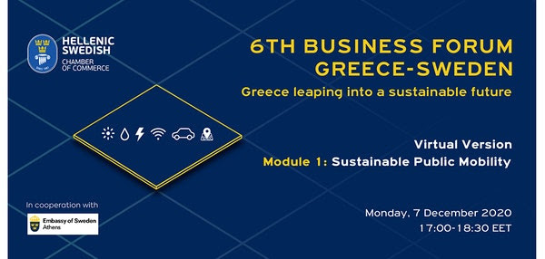 Το Ελληνο-Σουηδικό Εμπορικό Επιμελητήριο με τη συνεργασία της Πρεσβείας της Σουηδίας στην Ελλάδα διοργανώνουν για 6η συνεχή χρονιά το Επιχειρηματικό Φόρουμ Ελλάδας – Σουηδίας. Το Φόρουμ, με τίτλο Η Μετάβαση της Ελλάδας προς ένα Βιώσιμο Μέλλον, θα πραγματοποιηθεί σε ψηφιακό περιβάλλον και θα παρουσιαστεί σε θεματικές ενότητες με επίκεντρο τα Μέσα Μαζικής Μεταφοράς, τις Έξυπνες Πόλεις και την Κυκλική Οικονομία.
