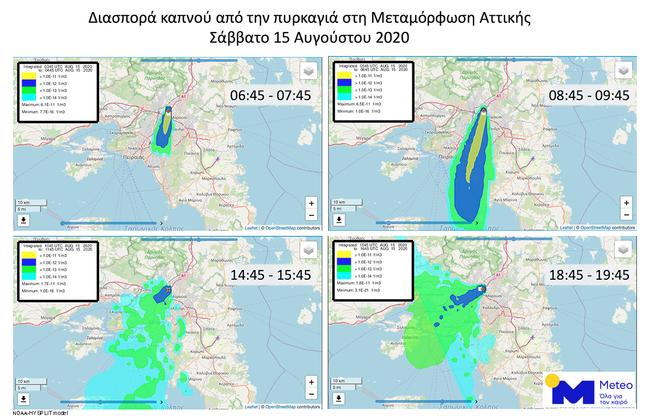 Το νέφος της πυρκαγιάς που ξέσπασε λίγο πριν τις 07:00 το πρωί του Σαββάτου 15/08 σε εργοστάσιο ανακύκλωσης πλαστικών επί της οδού Σωρού στη Μεταμόρφωση Αττικής σκέπασε μεγάλο μέρος της Αττικής μέχρι τις απογευματινές ώρες. Στο παρακάτω γράφημα παρουσιάζουμε μια πρώτη προσέγγιση του παράγοντα αραίωσης (δείκτης για τη συγκέντρωση ρύπων στην ατμόσφαιρα) από αριθμητικό μοντέλο πρόγνωσης για τα πρώτα 100μ ύψος από το έδαφος. Αμέσως μετά την έναρξη της πυρκαγιάς μεταξύ 06:45-07:45 βλέπουμε ότι το κέντρο της Αθήνας δέχθηκε μεγάλες ποσότητες αερολυμάτων (κίτρινες και μπλε αποχρώσεις), ενώ στη συνέχεια μέχρι το μεσημέρι και τα νότια προάστια της Αθήνας είχαν σκεπαστεί από το πυκνό νέφος. Τις απογευματινές ώρες οι ελαφρώς ενισχυμένοι βόρειοι άνεμοι μείωσαν τη συγκέντρωση του καπνού και παρατηρείται στροφή του πλουμίου προς τα δυτικά προάστια της Αθήνας. Η πυρκαγιά αργά το απόγευμα του Σαββάτου έχει τεθεί υπό έλεγχο και η συγκέντρωση καπνού έχει μειωθεί σημαντικά, παραμένουν όμως αυξημένες ποσότητες καπνού στην κατώτερη ατμόσφαιρα δυτικά της Αθήνας.