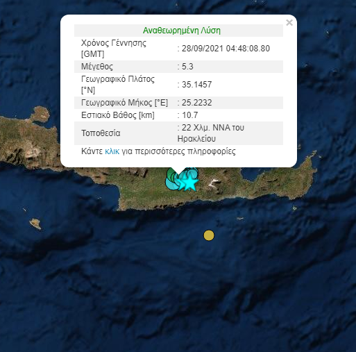 Σεισμική δόνηση μεγέθους 5.3 βαθμών της κλίμακας Ρίχτερ σημειώθηκε στις 07:48 το πρωί της Τρίτης 28-09-2021. Το επίκεντρο της δόνησης είναι 22 χλμ ΝΝΑ Ηρακλείου Κρήτης. Το εστιακό βάθος μετρήθηκε στα 10 χλμ.