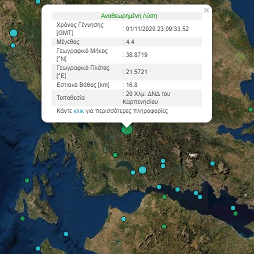 Σεισμική δόνηση μεγέθους 4.4 βαθμών της κλίμακας Ρίχτερ σημειώθηκε στις 01:09 το πρωί της Δευτέρας 02-11-2020. Το επίκεντρο της δόνησης είναι 20 χλμ δυτικά-νοτιοδυτικά του Καρπενησίου. Το εστιακό βάθος μετρήθηκε στα 15 χλμ.