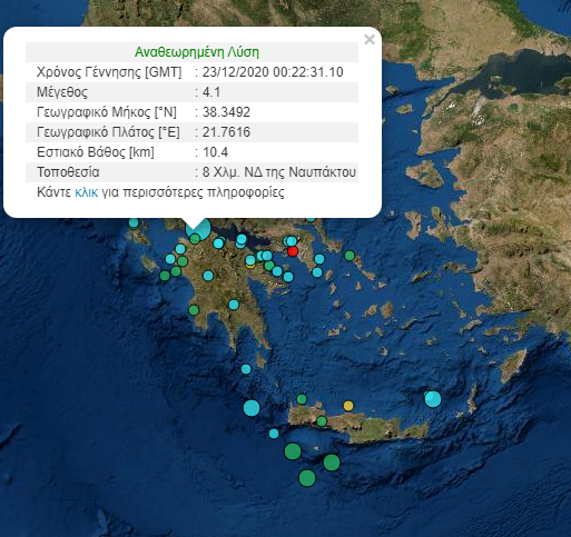 Ιδιαίτερη αισθητή ήταν η σεισμική δόνηση μεγέθους 4.1 βαθμών της κλίμακας Ρίχτερ που σημειώθηκε στις 02:22 το πρωί της Τετάρτης 23-12-2020. Το επίκεντρο της δόνησης ήταν 8 χλμ νοτιοδυτικά της Ναυπάκτου. Το εστιακό βάθος μετρήθηκε στα 10 χλμ.