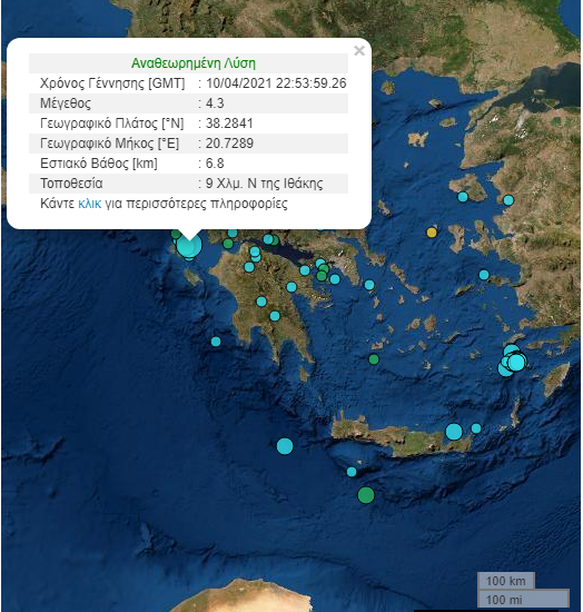 Σεισμική δόνηση μεγέθους 4.3 βαθμών της κλίμακας Ρίχτερ σημειώθηκε στις 01:53 το πρωί της Κυριακής 11-04-2021. Το επίκεντρο της δόνησης είναι 9 χλμ νότια της Ιθάκης . Το εστιακό βάθος μετρήθηκε στα 6.8 χλμ.