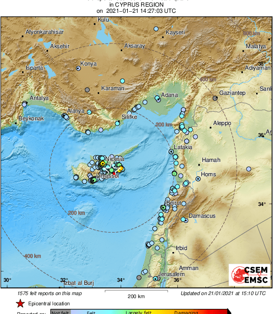 Σεισμική δόνηση μεγέθους 5.1 βαθμών της κλίμακας Ρίχτερ σημειώθηκε στις 00:09 το απόγευμα της Πέμπτης 2101-2021. Το επίκεντρο της δόνησης είναι 42 χλμ ανατολικά της Λευκωσίας. Το εστιακό βάθος μετρήθηκε στα 10 χλμ.