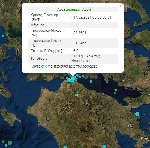 Σεισμική δόνηση μεγέθους 5.0 βαθμών της κλίμακας Ρίχτερ σημειώθηκε στις 05:36 το πρωί της Τετάρτης 17-02-2021. Το επίκεντρο της δόνησης είναι 11 χλμ ανατολικά-νοτιοανατολικά της Ναυπάκτου . Το εστιακό βάθος μετρήθηκε στα 6 χλμ