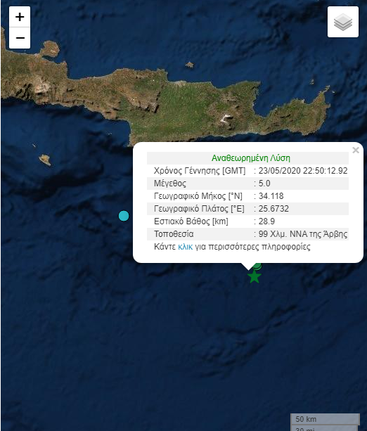 Σεισμική δόνηση μεγέθους 5.0 βαθμών της κλίμακας Ρίχτερ σημειώθηκε στις 01:5ο το πρωί της Κυριακής 24-05-2020. Το επίκεντρο της δόνησης είναι 99 χλμ Νότια – Νοτιοανατολικά της Άρβης Ηρακλείου Κρήτης .
