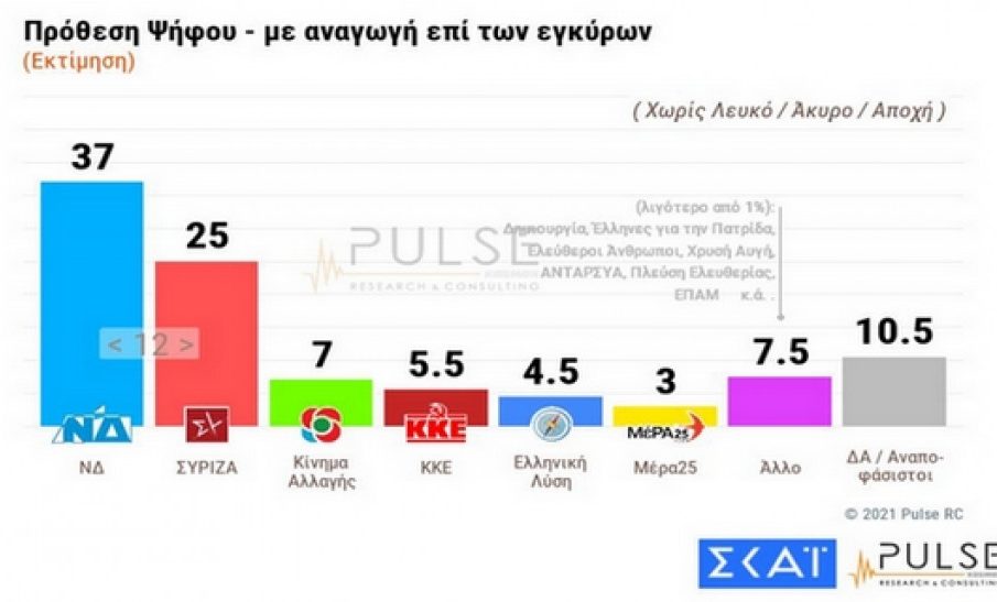 Προβάδισμα 12 μονάδων διατηρεί η Νέα Δημοκρατία έναντι του ΣΥΡΙΖΑ στην πρόθεση ψήφου με αναγωγή επί των εγκύρων, σύμφωνα με τη νέα μεγάλη δημοσκόπηση του ΣΚΑΪ και της Pulse που παρουσιάστηκε στο κεντρικό δελτίο ειδήσεων με τη Σία Κοσιώνη. Πιο αναλυτικά, η ΝΔ συγκεντρώνει 37%, ο ΣΥΡΙΖΑ 25%, ενώ ακολουθούν Κίνημα Αλλαγής με 7%, ΚΚΕ με 5,5%, Ελληνική Λύση με 4,5%, ΜέΡΑ25 με 3%. «Άλλο» απάντησε το 7,5% ενώ οι Αναποφάσιστοι/ΔΑ φτάνουν στο 10,5%.