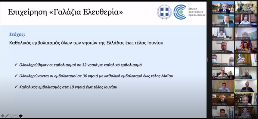 «Ο στόχος είναι ο καθολικός και πλήρης εμβολιασμός των μονίμων κατοίκων των νησιών το αργότερο έως τα τέλη Ιουνίου. Οι νησιώτες μας δηλαδή να υποδεχθούν το φετινό καλοκαίρι ασφαλείς και απόλυτα θωρακισμένοι από τον κορονοϊό. Είναι σαφές ότι το πρόγραμμα αυτό θέλει να στηρίξει τις τοπικές νησιωτικές κοινωνίες και την οικονομία τους. Φιλοδοξεί όμως να προσφέρει και ένα θετικό πρόσημο στη συνολική εικόνα του τουρισμού μας», τόνισε ο Πρωθυπουργός Κυριάκος Μητσοτάκης, ανοίγοντας την τηλεδιάσκεψη για την επιχείρηση «Γαλάζια Ελευθερία» που προβλέπει τον εμβολιασμό όλων των μόνιμων κατοίκων των νησιών ως το τέλος Ιουνίου.