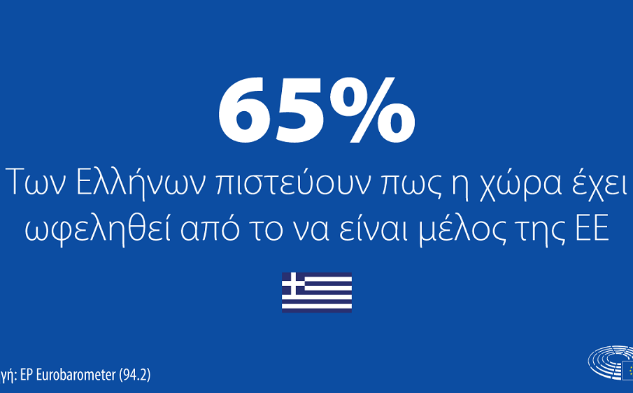 - Το 65% των Ελλήνων δηλώνει ότι η χώρα έχει ωφεληθεί από την ένταξη στην ΕΕ.