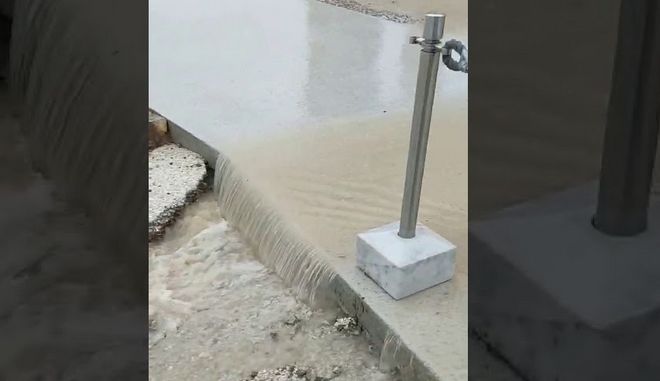 Το νερό δεν βρήκε φυσική διέξοδο και πλημμύρισε δημιουργώντας μικρούς καταρράκτες και ρυάκια όπως φαίνεται σε βίντεο που ανέβηκε στο διαδίκτυο.